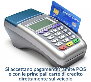 Il pagamento può avvenire: in rimessa diretta in contanti o carte di credito/bancomat direttamente sul veicolo con rilascio di ricevuta fiscale, oppure mediante bonifico bancario a 30 gg. d.f. dopo emissione di fattura (Iva al 10%)